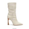 El botín gia está diseñado en cuero con punta puntiaguda, tacón de aguja llamativo y silueta favorecedora a media pantorrilla.